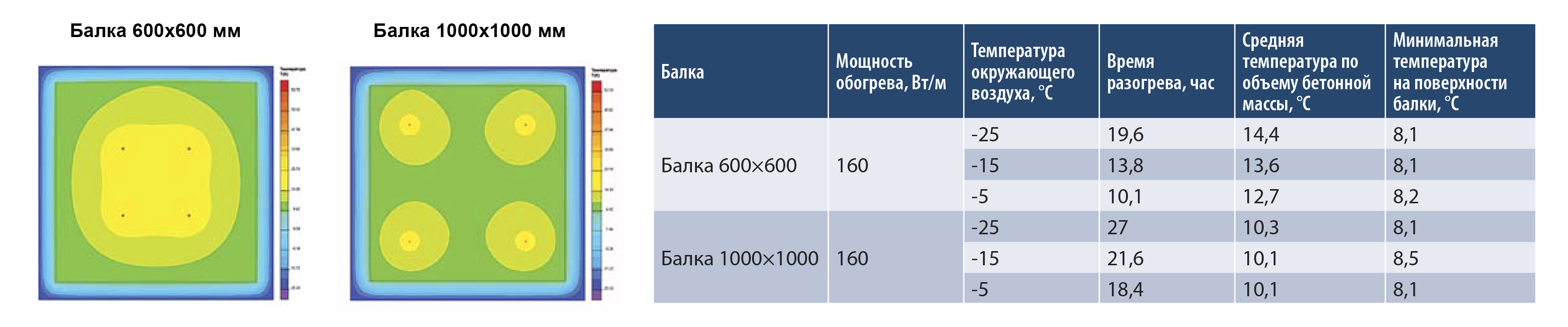 При обогреве железобетонных балок без применения теплоизоляции корпуса опалубки при температуре окружающего воздуха -25 °С мощность, требуемая для разогрева, должна составлять 7000 Вт/м.