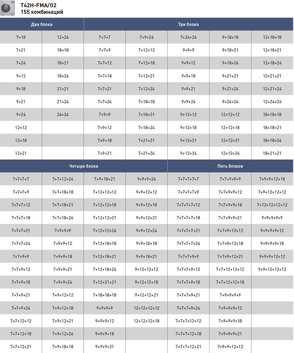 Общая площадь охлаждения до 120 кв.м, комбинации внутренних блоков подбираются индивидуально.