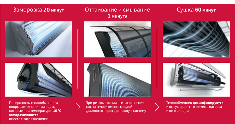 • Frost Wash — инновационная система самоочистки теплообменника: в течение 20 минут теплообменник замораживается до -15 °C, затем, в течение 1 минуты происходит резкое оттаивание, и с образовавшимся конденсатом смываются все загрязнения и выводятся через дренаж. После этого в течение 1 часа в режиме обогрева и вентиляции теплообменник просушивается и обеззараживается.