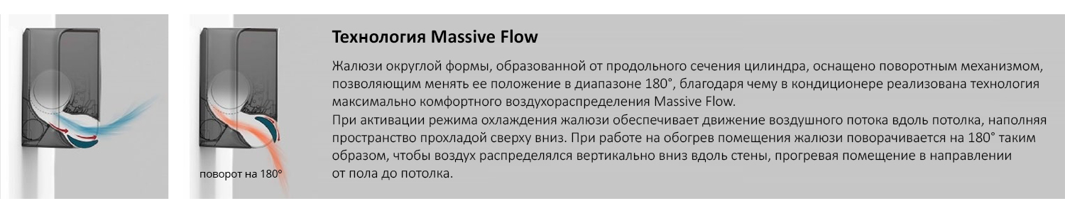 • Технология Massive Flow — особенная округлая форма жалюзи направляет воздух вертикально вдоль стены к полу, когда помещение нужно обогреть. А в случае, когда требуется охладить — поворачивается на 180°, рассеивая холодный воздух от потолка к полу.