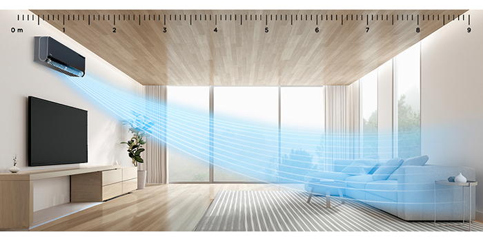 • Протяженный воздушный поток — специальная усовершенствованная форма вентилятора и особенные круглые жалюзи создают мощный протяженный поток воздуха длиной до 9 метров. Такая особенность позволяет эффективно охлаждать помещения вытянутой формы.