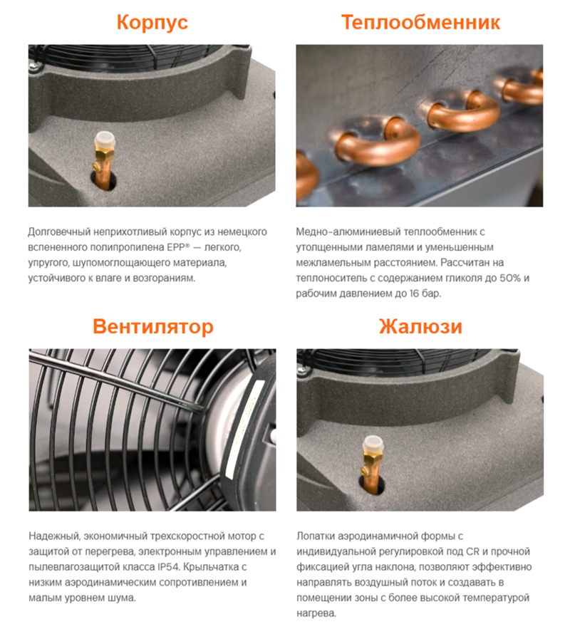 Тепловентиляторы Sonniger CR нового поколения, благодаря увеличенному размеру ребер теплообменника и уменьшенному расстоянию между ними, обеспечивают еще большую ΔT° и эффективно работают на всех скоростях вентилятора.
