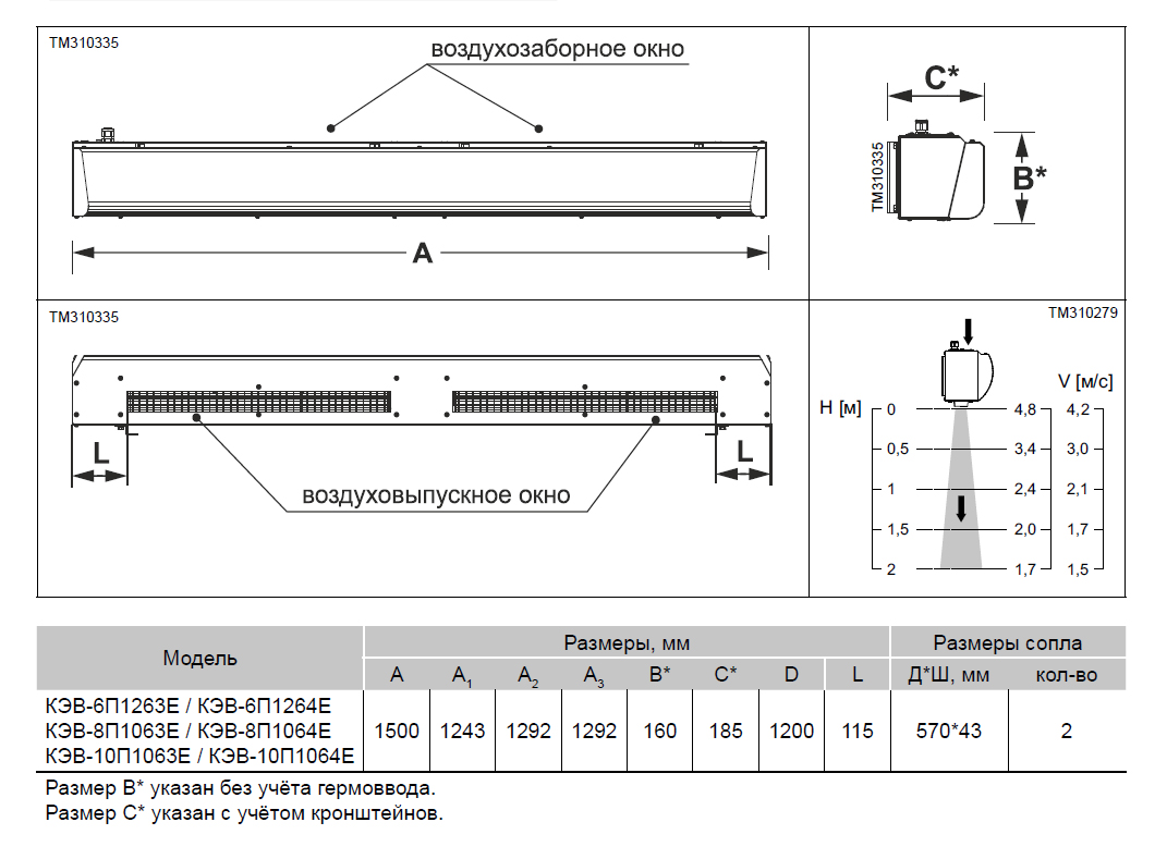 Эффективная длина струи может служить оценкой допустимой ширины или высоты проема, который защищает завеса. При вертикальной установке завес с двух сторон проема, значение, следует понимать как полуширину. Параметр указан только для "мягких" наружных условий, т.е. температура воздуха не опускается ниже 0 °С, а скорость ветра не превышает 1м/с, приточно-вытяжная вентиляция сбалансирована. Любое ужесточение условий уменьшает эффективную длину струи на 50%.