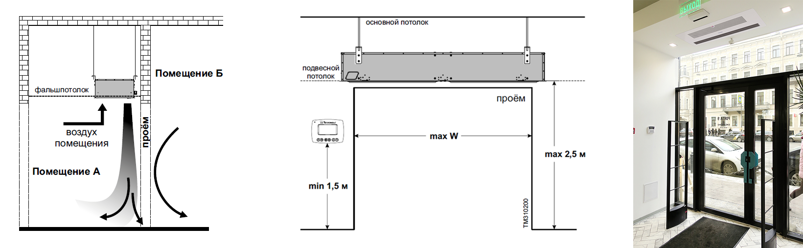 Встраивается в подвесной или фальш-потолок над дверным проёмом, на высоте не более 2,5 м. Благодаря такой установке завеса выглядит эстетично, не портит  общий вид.