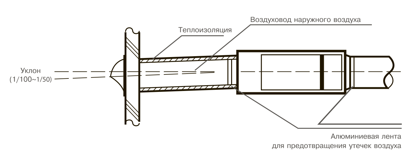 - Воздуховод наружного воздуха должен монтироваться с небольшим уклоном наружу во избежание проникновения осадков.